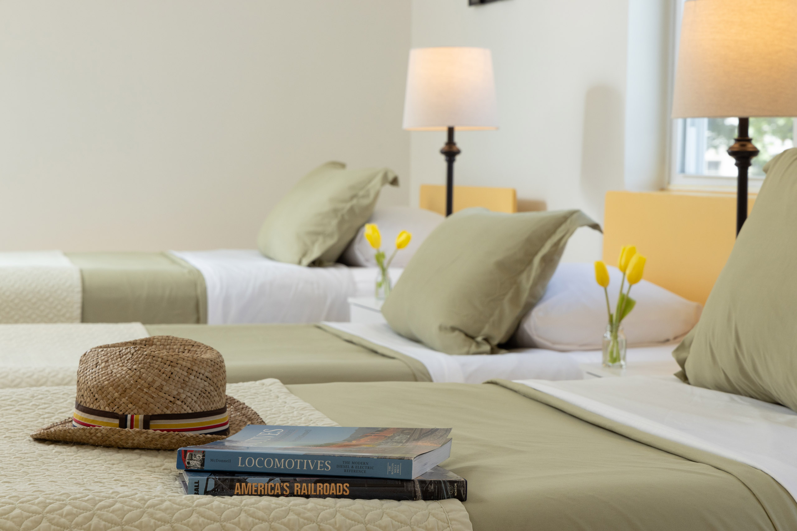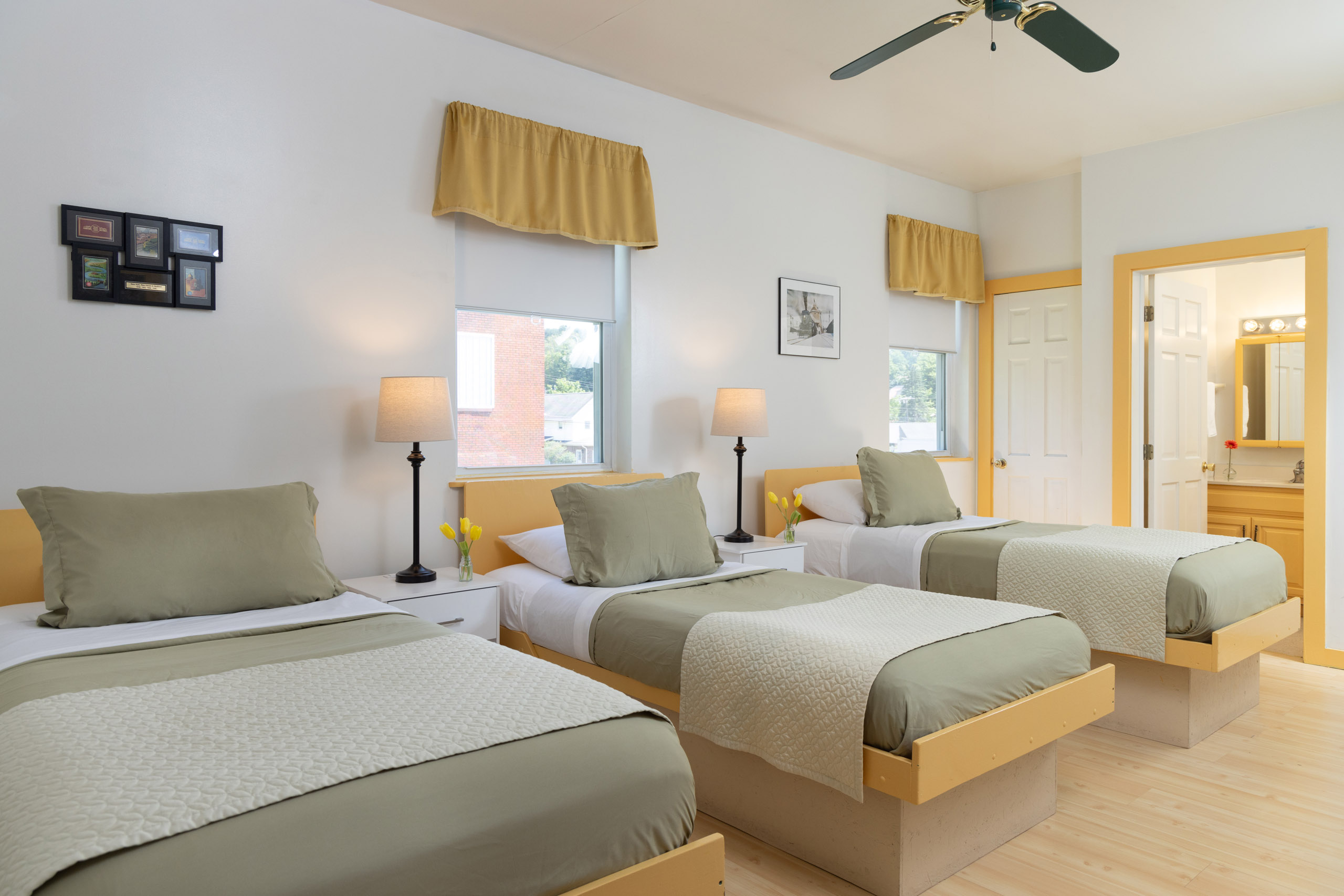 Located away from the tracks in the back of the first floor of the building, the New Haven Room features three twin beds in the room. The Norfolk Southern mainline is somewhat visible from one of the windows, but we would not consider this a trackside room.